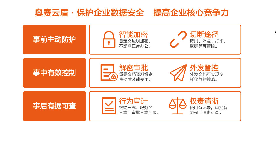 奧賽數(shù)據(jù)資產(chǎn)管理解決方案可以讓中佳華悅能夠?qū)崿F(xiàn)數(shù)據(jù)集中存儲、文件多重備份、文件安全加密、文檔外發(fā)管控等功能,有效地保護(hù)中佳華悅的專利、核心技術(shù)、研發(fā)成果,鞏固公司在行業(yè)里的競爭力。同時(shí)數(shù)據(jù)高速共享、文件自動同步、上網(wǎng)行為規(guī)范等功能可以提高公司的工作效率,給公司帶來更高的效益,降低人力成本。