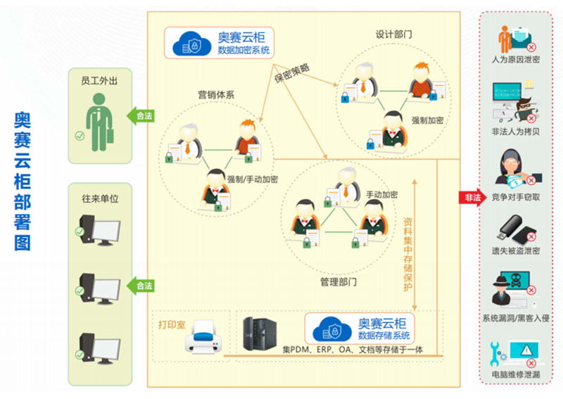 奧賽數(shù)據(jù)管理以數(shù)據(jù)加密和權(quán)限管理為核心,結(jié)合身份認(rèn)證、日志審計(jì)、文檔備份、外發(fā)管理等功能以及系統(tǒng)本身的容災(zāi)管理和多樣化安全策略,實(shí)現(xiàn)數(shù)據(jù)資料多元化管理。