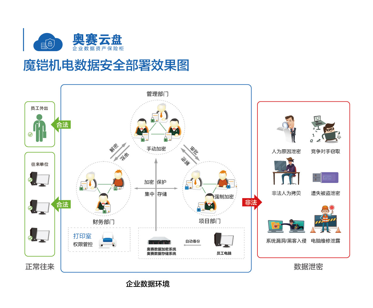根據(jù)魔鎧機電現(xiàn)狀,奧賽數(shù)據(jù)存儲系統(tǒng)以及奧賽數(shù)據(jù)加密系統(tǒng),可以為企業(yè)搭建一個全面的數(shù)據(jù)安全中心,實現(xiàn)數(shù)據(jù)的集中存儲、崗位權(quán)限管控、數(shù)據(jù)高速共享以及文件加密防外泄等。