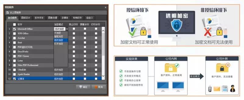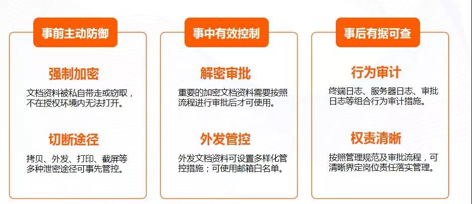 重要數(shù)據(jù)資料在加密基礎上,實現(xiàn)內(nèi)外部數(shù)據(jù)流轉管控。核心重要資料的非常規(guī)內(nèi)部使用,必須經(jīng)過解密審批單獨授權。公司外部的流轉使用,可通過限定次數(shù)、限定時間、限定電腦、限定對象來進行管控。
