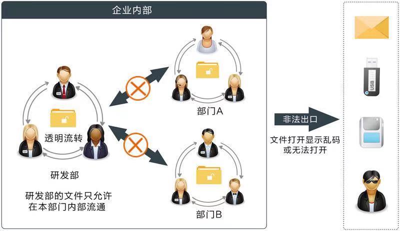 奧賽云盾采用驅(qū)動層加密技術(shù),進行文件加密,不改變員工操作習(xí)慣、不改變文件格式、不封閉公司網(wǎng)絡(luò)、不封閉外設(shè)端口,內(nèi)部流通自由正常。 加密文件在未授權(quán)的情況下脫離企業(yè)網(wǎng)絡(luò),文件就無法正常訪問,形成“對外受阻,對內(nèi)無礙”局面!有效保障企業(yè)的數(shù)據(jù)安全。