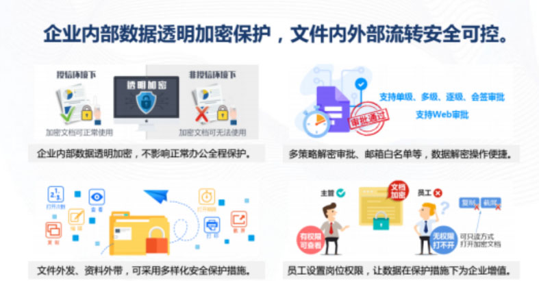 數(shù)據(jù)加密:保護(hù)核心數(shù)據(jù),杜絕各種途徑泄密。文檔全部自動加密,數(shù)據(jù)保護(hù)全面升級。重要的文件類型自動加密,未經(jīng)授權(quán)無法打開;重要部門/人員的機(jī)要文件自動加密,及時丟失也不怕。