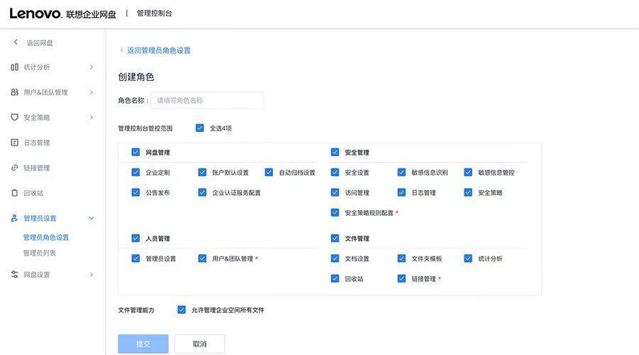 隨著公司發(fā)展壯大,文件管理難度自然會(huì)隨之提高,那么該讓誰(shuí)來(lái)管、用什么方式管、怎樣管效率高就都變成需要考慮的問(wèn)題。通過(guò)聯(lián)想Filez,輕松實(shí)現(xiàn)精細(xì)化的文件權(quán)限管理,公司可以自定義設(shè)置管理員角色,從網(wǎng)盤(pán)管理、安全管理、人員管理、文件管理、前臺(tái)文件管理五個(gè)維度進(jìn)行配置,賦予每一個(gè)管理員專(zhuān)屬權(quán)限。企業(yè)在靈活組合出適合不同辦公場(chǎng)景的管控模式的同時(shí),保證了權(quán)責(zé)分散,各管理員之間相互制約。