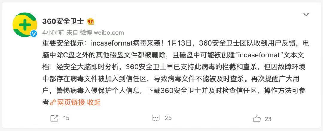 2021年1月13日,深信服、360、火絨安全實(shí)驗(yàn)室等國(guó)內(nèi)安全公司對(duì)外發(fā)布預(yù)警,稱(chēng)一種名為incaseformat的蠕蟲(chóng)病毒在國(guó)內(nèi)爆發(fā)。incaseformat病毒爆發(fā),涉及醫(yī)療、教育、運(yùn)營(yíng)商等多個(gè)行業(yè),且感染多為財(cái)務(wù)管理相關(guān)應(yīng)用系統(tǒng),感染表現(xiàn)為所有非系統(tǒng)分區(qū)文件均被刪除。