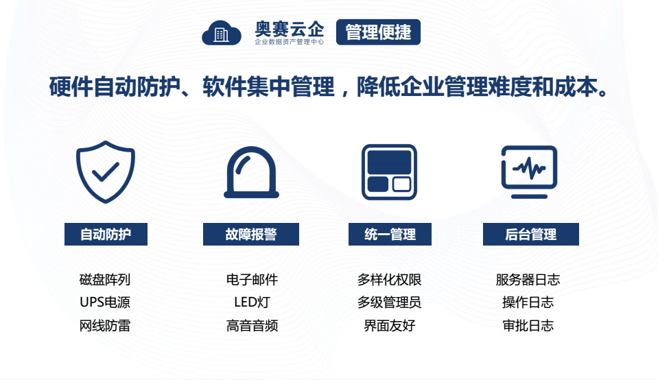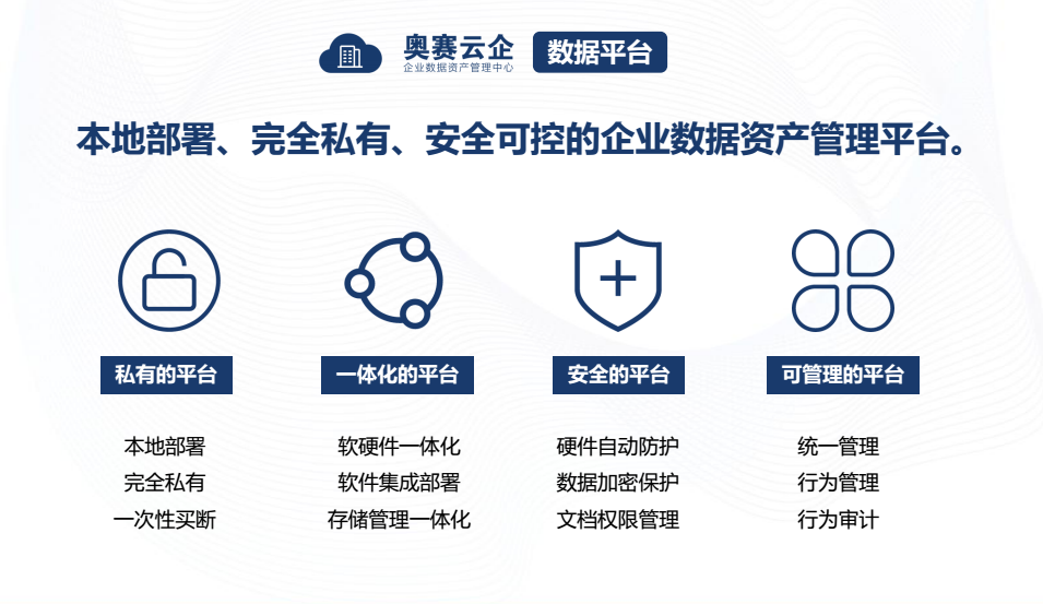 奧賽云企,由奧賽服務(wù)器、奧賽數(shù)據(jù)存儲系統(tǒng)、奧賽數(shù)據(jù)安全系統(tǒng)及奧賽文檔管理系統(tǒng)組成,為企業(yè)搭建高性能且易維護的硬件平臺,提供強大高效的數(shù)據(jù)資產(chǎn)管理工具,幫助企業(yè)構(gòu)建安全可靠的數(shù)據(jù)環(huán)境,通過強化數(shù)據(jù)管理和數(shù)據(jù)流轉(zhuǎn)產(chǎn)生價值,提高企業(yè)核心競爭力。