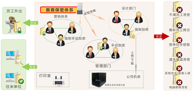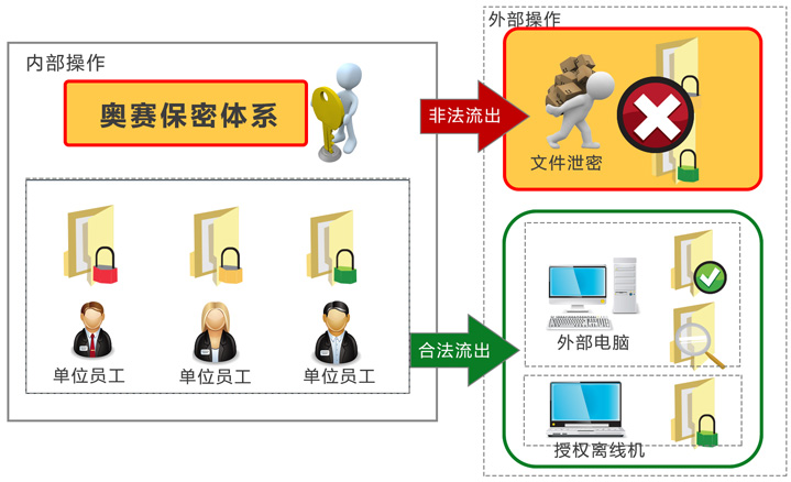 奧賽云盾反泄密軟件對(duì)已有的或正在生成的Office電子文檔、PDF等各種格式的電子文檔及設(shè)計(jì)圖紙進(jìn)行加密保護(hù),被加密的文檔只能被授權(quán)用戶在授權(quán)環(huán)境(如,企業(yè)內(nèi)部網(wǎng)絡(luò)) 中應(yīng)用,文檔在創(chuàng)建、存儲(chǔ)、應(yīng)用、傳輸?shù)拳h(huán)節(jié)中均為加密狀態(tài),未經(jīng)授權(quán)或脫離授權(quán)環(huán)境,加密信息均無(wú)法打開(kāi)使用。